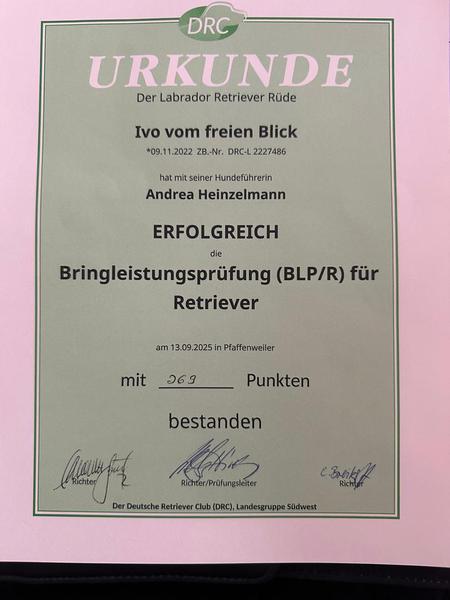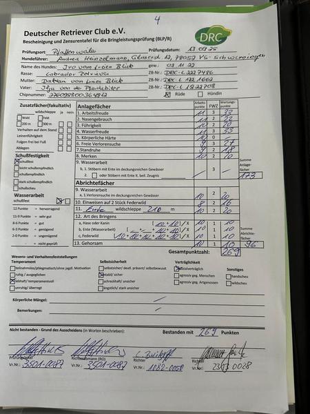 Zunächst nimmt sie erfolgreich an der Brauchbarkeitsprüfung des LJV Sachsen-Anhalt teil und wird hier an der lebenden Ente geprüft. Eine Woche später besteht sie die BLP des DRC in Weesow.